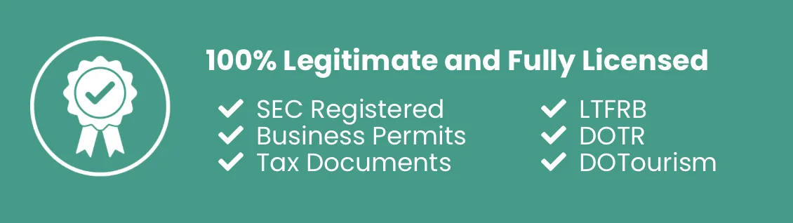 "Sure ba na legit kayo?" We serve many industries like BPO companies, and international tourists. Complete SEC papers and business permits. Real company with real track record.